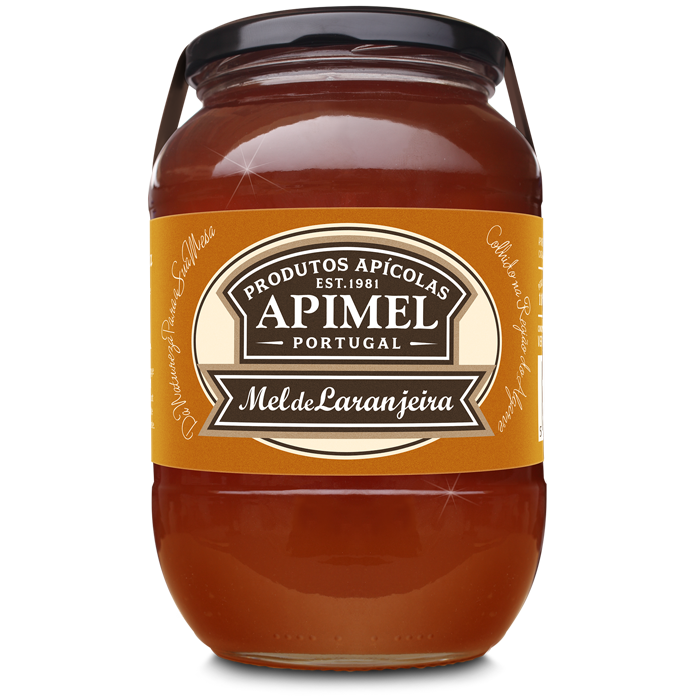 • Frasco de mel de laranjeira da Apimel com etiqueta laranja