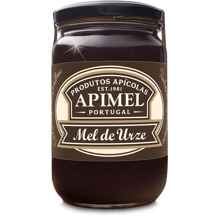 • Frasco de Mel de Urze Apimel Portugal com rótulo castanho e bege
