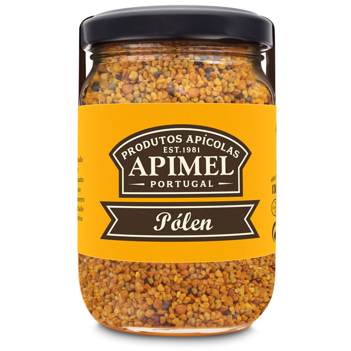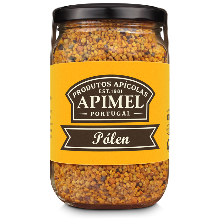 Pote de vidro com pólen e rótulo amarelo Apimel Portugal