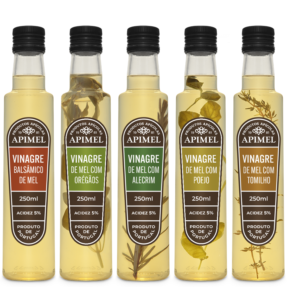 Descubra outra dimensão de sabor com esta deliciosa selecção de Vinagres de Mel e Ervas Aromáricas, obtidos através de um processo natural de dupla fermentação, através do qual o mel é convertido em hidromel e num segundo estágio em vinagre, sendo finalmente sujeito a uma infusão de plantas.