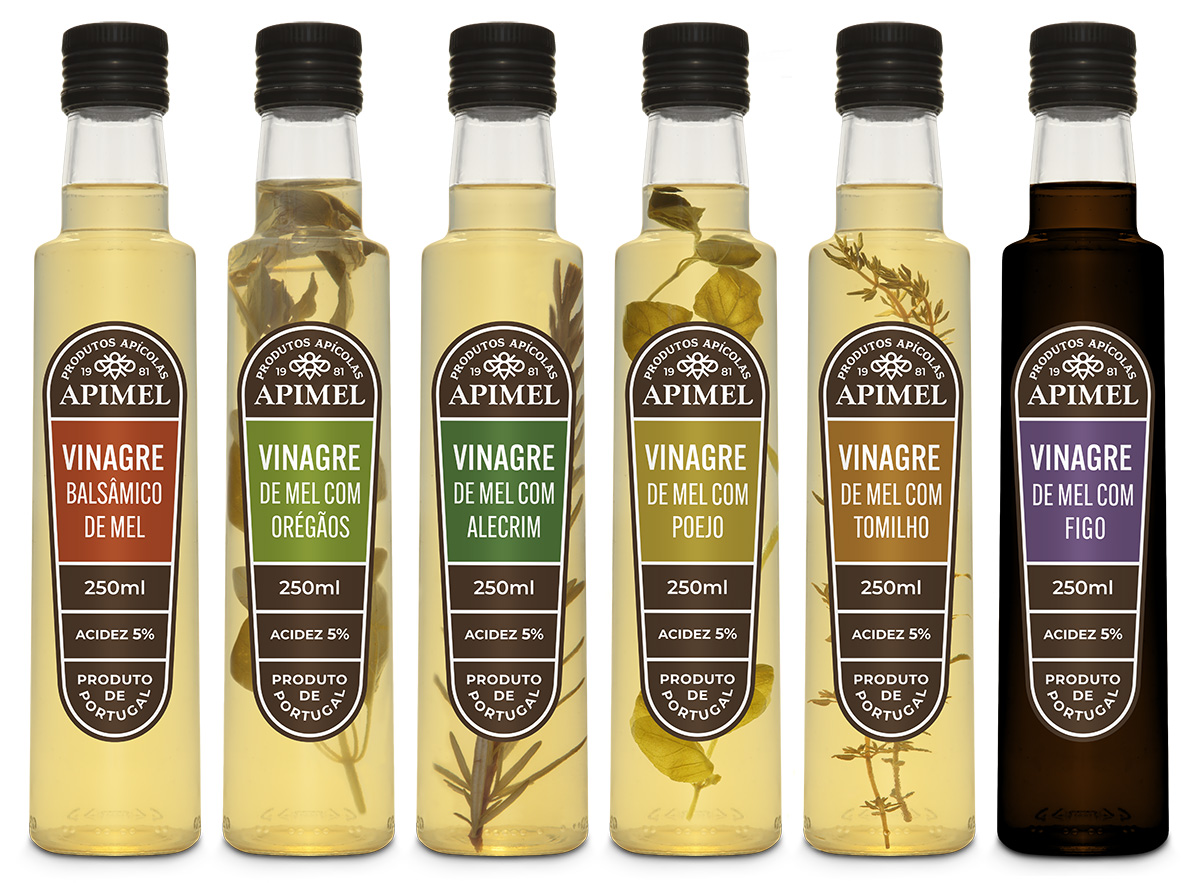 • Seis garrafas de vinagre de mel da APIMEL com diferentes ervas e sabores em embalagens variadas.
