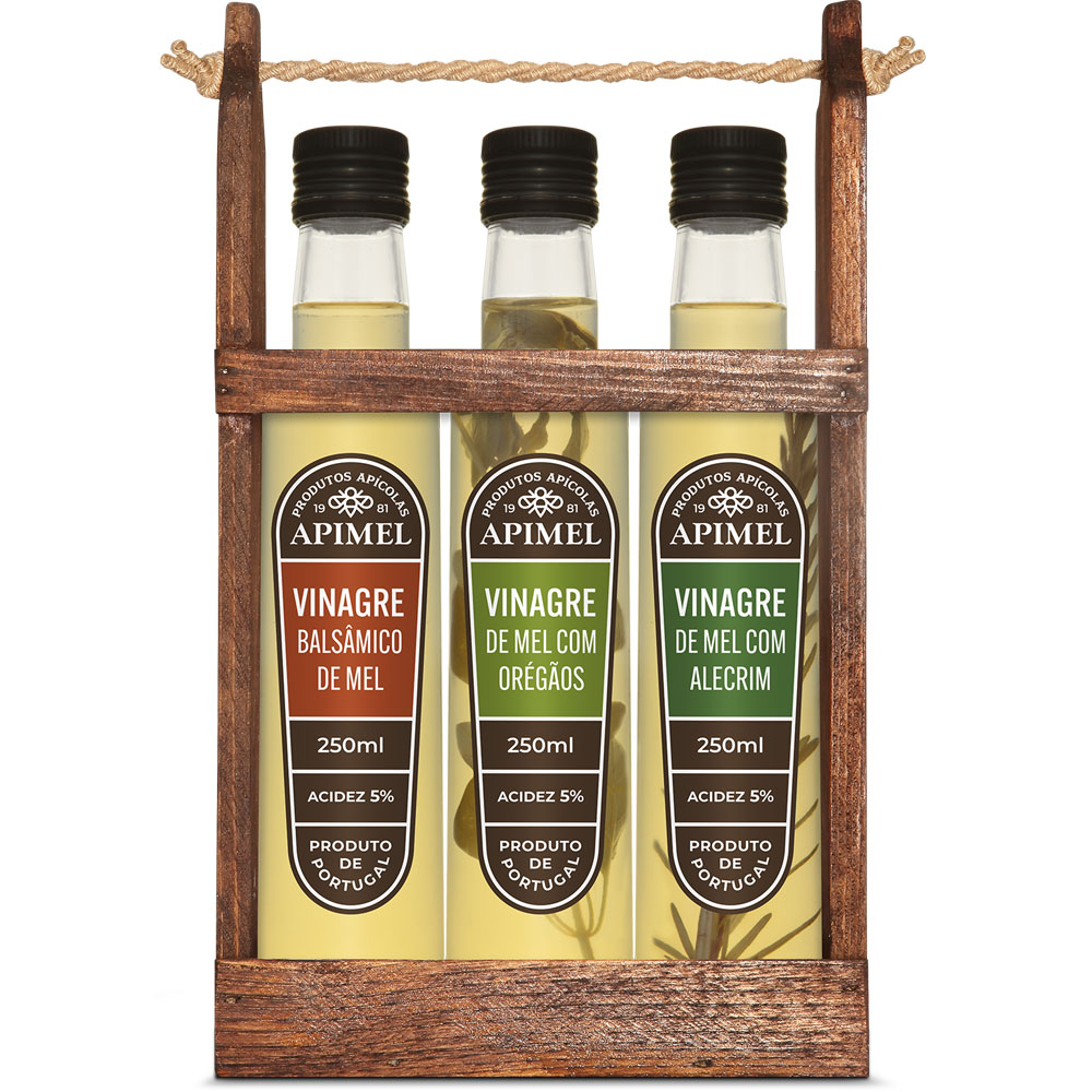 • Três frascos de vinagre de mel Apimel em embalagem de madeira com corda.
